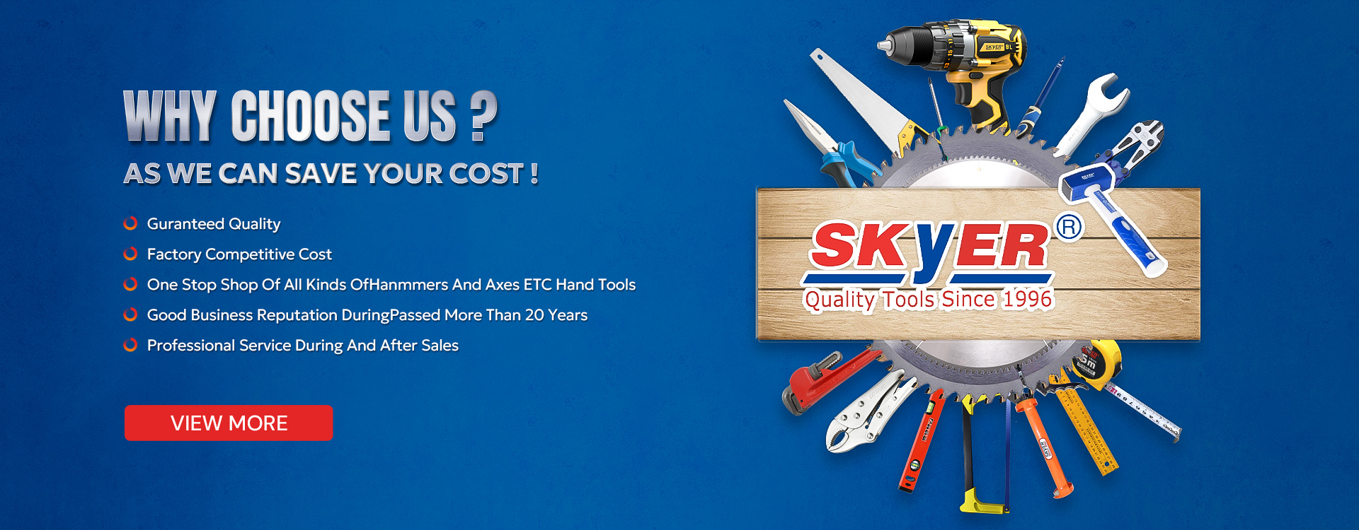 Founded in 2009, SKYER TOOLS MANUFATURE (HUAIAN) CO., LTD. is a manufacturer specializing in production and export of various striking tools and farm tools such as hammer, axe, pickaxe, chisel and crowbar, especially production of various tools with plastic-coated handle.